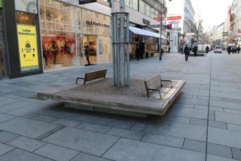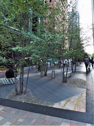 商業施設や道路には、大きな敷地に立派な植栽や樹木、ベンチがデザインされている