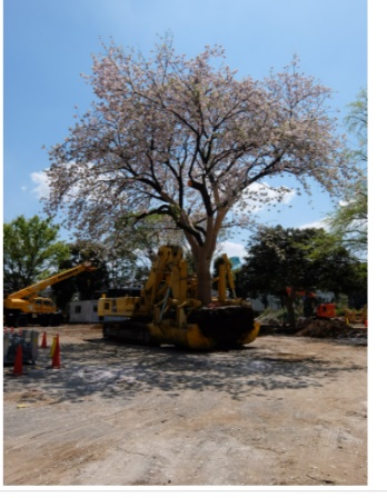 公園のこの位置に図書館を作るということは基本計画で決められてました。図書館を建てた場所にはバーベキュー広場がありました。大きな水景があったり、イチョウの列植があったり、とても豊かな環境の公園でした。「新建築」にも松田平田設計さんが書かれていますが、敷地調査をしつつ、どれだけ既存樹を切らないで建築を作るかというのを、3Dスキャンで立体的にスキャンして、新しい築建物と既存樹の間のどこにクレーンが入るかとか、設計段階でも検討しました。そのおかげで、市民の方にも保存する木と移植する木を説明し理解してもらいました。ここに写真がありますが、これはみんなが大好きだった桜の木を移植しました。重機移植という移植で、大きな3mΦくらいの根鉢をそのまま移植するので、上を剪定しなくて移植できるのです。普通の移植は根を切るので枝ぶりも小さくするため、移植した後はこじんまりしちゃうんですけれど、そうじゃない移植ができたというのは、よかったです。
