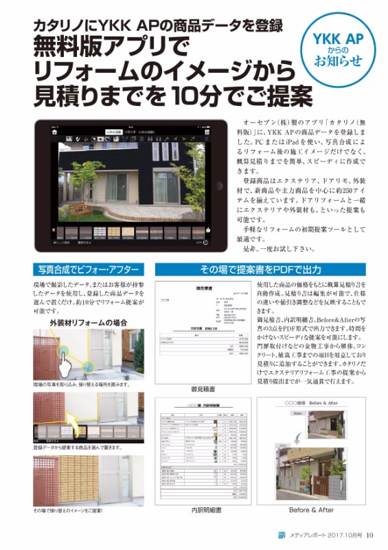 カタリノの活用事例が増えてきました。 2017 9/30 注目の商品情報 2017年9月30日2023年9月20日 すぐ提案できるからすぐ決まる、初期提案ツール、カタリノ。 積極的に活用してエクステリアを提案し受注している事例の一部をご紹介いたします。是非ご活用願います。 PDFデータはこちら ダウンロードできない場合は、「ダウンロードする」を右クリックし、「対象のファイルを保存」を選んでダウンロードしてください。 注目の商品情報