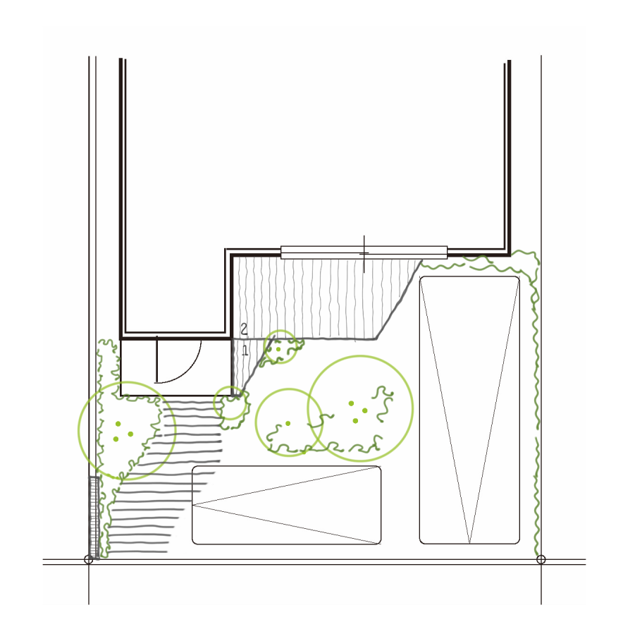 狭小地では敷地の中に建物をどう建てるか、駐車スペースをどうレイアウトするかが重要になってきます。車を停めることができたらOKと考えるのではなく、その空間をもっと有効活用できる庭となる場所を残す計画を目指します。
