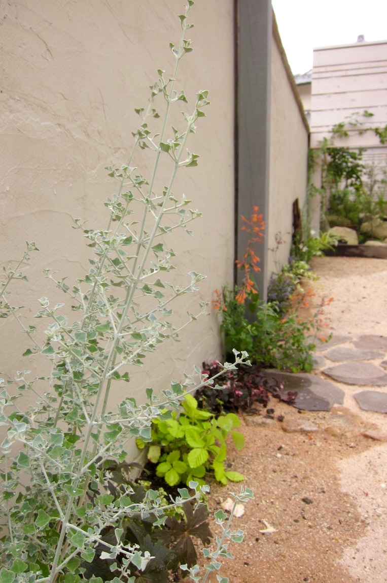 駐車スペースの隣地境界沿いに確保した10センチの土部分に灌木や草花など様々な植物を植えました。成長した植物は土間との境界を消し、10センチの隙間に植えただけだとは思えない豊かな表情を作ります。