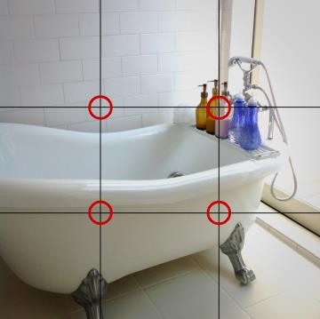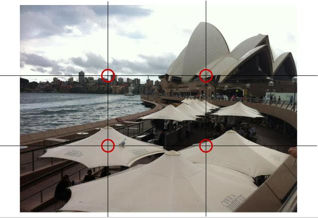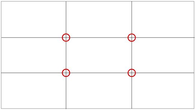 画面の縦と横を3分割し、被写体を線上や線との交点(赤い点)に配置する考え方です。主役になる被写体をこの4つの赤い点のどれかにあわせます。